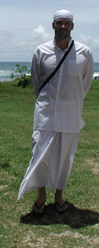 here in this buddhist land a full moon calls the villagers to a party called "Full Moon Day" ("poya" in sinhalese). most folks get dressed up in their sunday best (as it were) and head off to temple to consider weighty topics like Karma. to think on what is Good and what is Wrong. Buddha. Body. Mind. prabath and chamindra invited me along and since this is one of the side-benefits of travel.rule#2, it was a made decision. so i took a cab up to Galle and ordered up a nice sarong and a clean white shirt for the evening. custom-fit and sewn in 24 hours for about $6. now i havent worn this much white, ever. but i have to say i look pretty dap in the sri lankan national uniform (the cap comes off with your sandals when you enter temple). this is, in essence, the local version of a tux. fashion can kiss my ass, but i do know this getup is a helluva lot more comfortable than a tux.