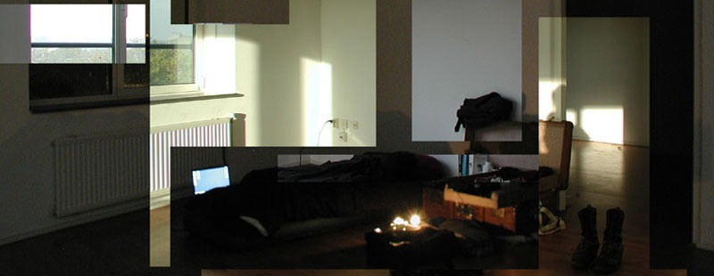this is a photograph of the place. i left my camera on the shelf and took photos of the bed over the course of several days (in the morning, in the afternoons, at night with the candles near the bed since there's no lights in the place), noticing how time slides by but things don't, really, change.