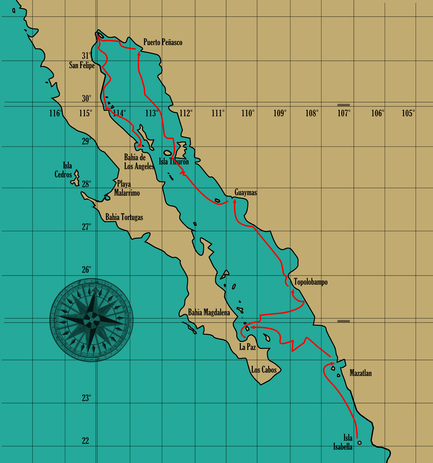 First, this day brought the unwelcomed confirmation that The Baja was not an island, but a peninsula. Many of the members of the crew had suspected it for weeks since the western edge of the sea can be seen for most of the voyage north, and when the mountains cannot be made out the occasional cloud which gathers over hills, marking islands or coastlines, can. So there was no great surprise when Ulloa finally found himself and crew in the reddish cul-de-sac of the northernmost point of The Sea.